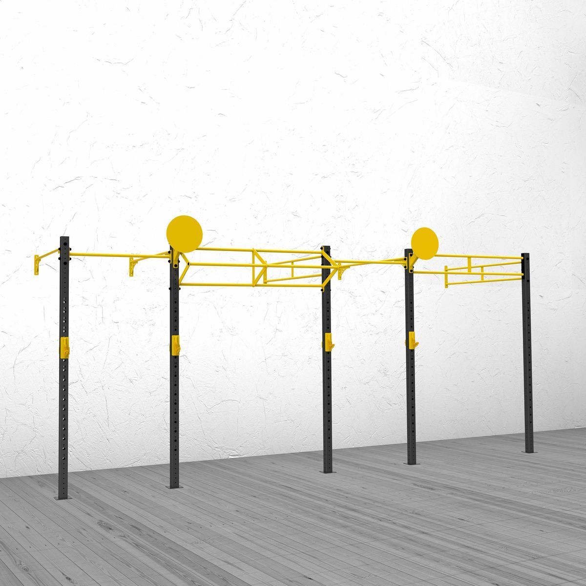 А0312 Функциональная рама 5800-1800.Функциональная рама для кроссфита – неотъемлемый атрибут любого crossfit-зала, универсальное решение необходимое для проведения комплексных тренировок и выполнения силовых упражнений.Основные элементы рамы выполнены из профильной трубы 80*80*3 мм,трубы d32 мм и листов металла 8 и 10 мм. Состав:Стойка перфорированная 80х80, ZSO-2680-5 шт Перекладина одинарная УСИЛЕННАЯ d32, ZSO-1800 -3 шт Перекладина двойная d32, ZSO-1800-3 шт Перекладина одинарная d32, ZSO-1100-2 шт Перекладина треугольная d32/32/32, ZSO-1800- 1 шт Мишень для медбола, ZSO -2 шт Крюки для штанги, ZSO, (пара) — 2 шт