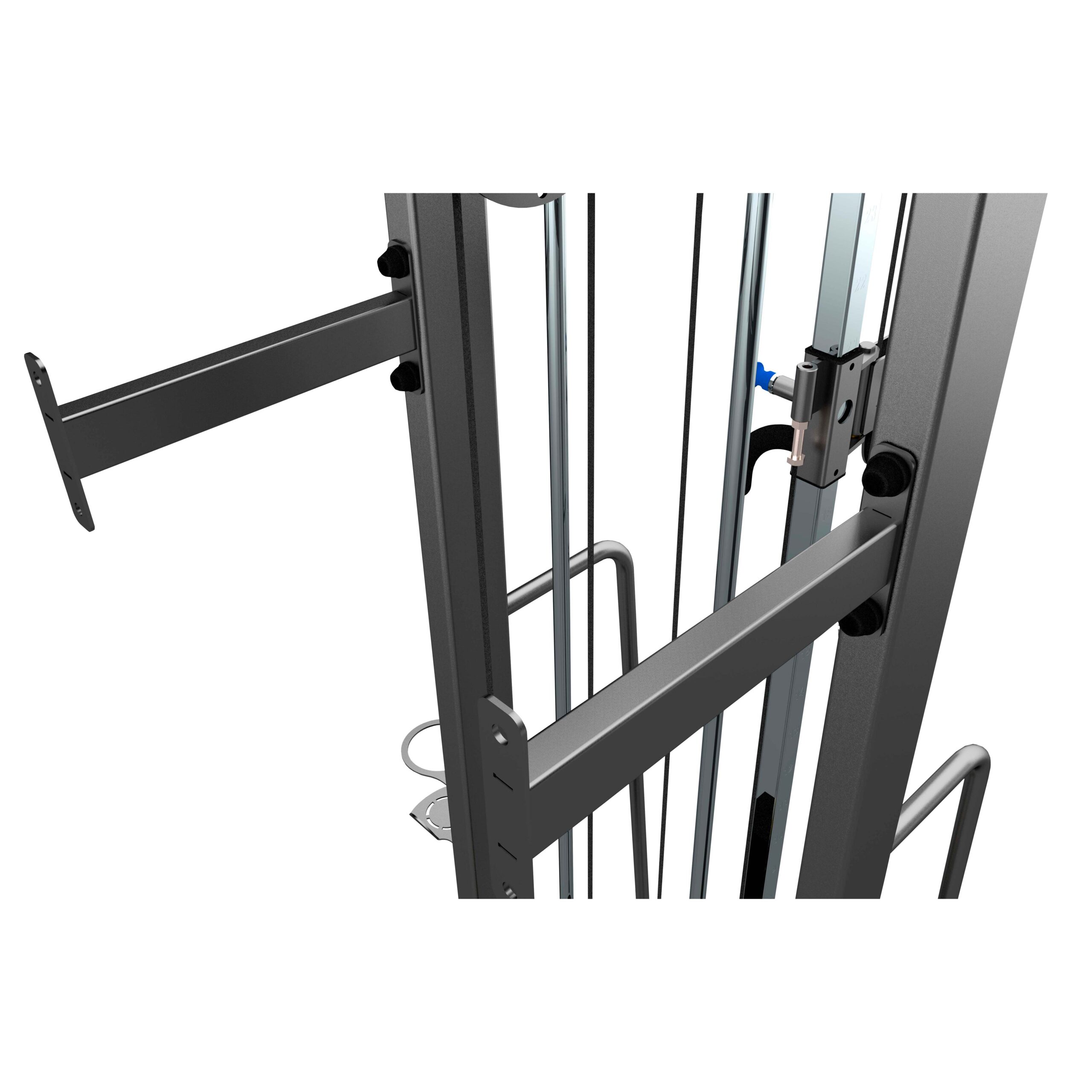 Тренажёр оснащён вертикальной металлической направляющей, по которой перемещается рабочий узел с рукоятью, обеспечивая регулировку его положения по высоте.