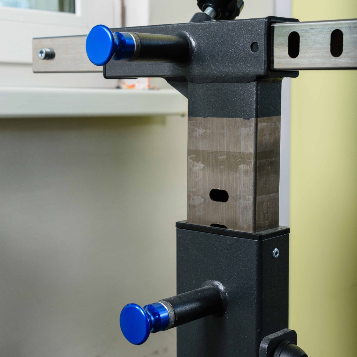 Узел с валиками и опорной платформой регулируется по вертикали и горизонтали при помощи механического фиксатора с оттяжным механизмом, что позволяет точно подстроить рабочее положение под рост и длину ног пользователя. Конструкция фиксатора (стопорный оттяжной механизм) исключает люфты подвижных элементов и обеспечивает плавную настройку положения. Направляющая для регулировки выполнена из нержавеющей трубы, обеспечивающей плавность хода и долговечность конструкции.