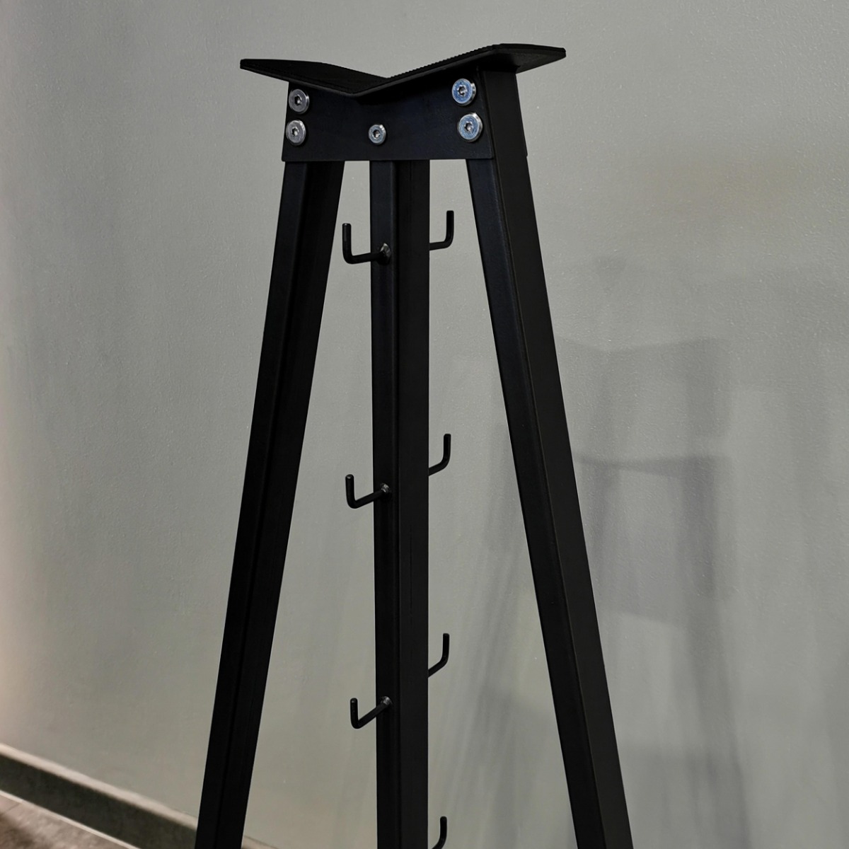 Стойка предназначена для хранения и удобного использования двух комплектов рукояток для блочных тренажеров PROFI-FIT-RT-026. Представляет собой сборную металлическую конструкцию с вертикальными крючками и полочкой для инвентаря.