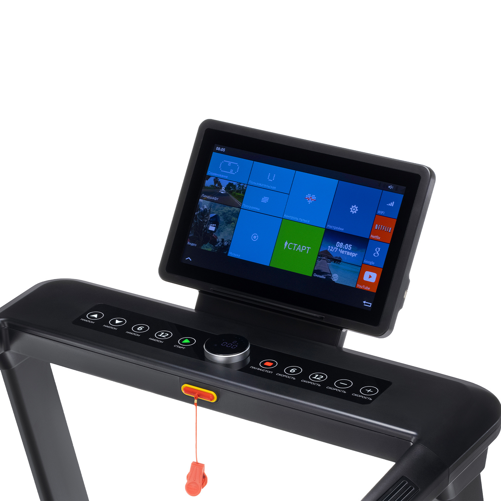Управление осуществляется с помощью консоли с TFT-дисплеем, имеющим выход в интернет. Встроенные колонки с поддержкой Bluetooth позволяют воспроизводить музыку во время занятий. Беговая дорожка рассчитана на пользователей весом до 140 кг и ростом до 200 см, оснащена транспортировочными роликами и компенсаторами неровности пола. Модель выполнена в стильном дизайне цвета Infinite, что позволяет ей гармонично вписаться в любой интерьер.
