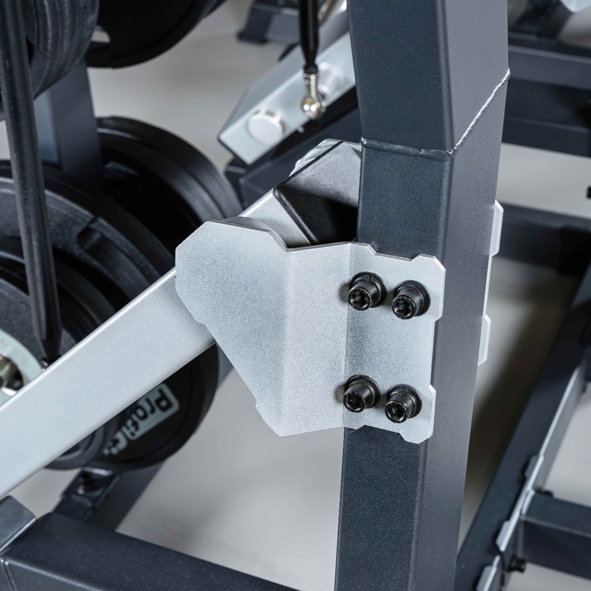 На раме тренажера установлено шесть хромированных накопителей из толстостенной стальной трубы для хранения свободных весов и два на подвижных рычагах.