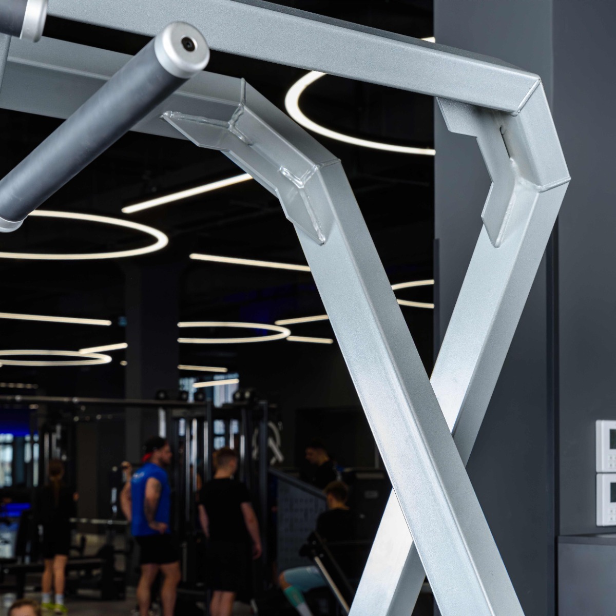 На раме установлено два хромированных накопителя из толстостенной стальной трубы для хранения свободных весов и два подвижных рычагах для работы со свободными весами.