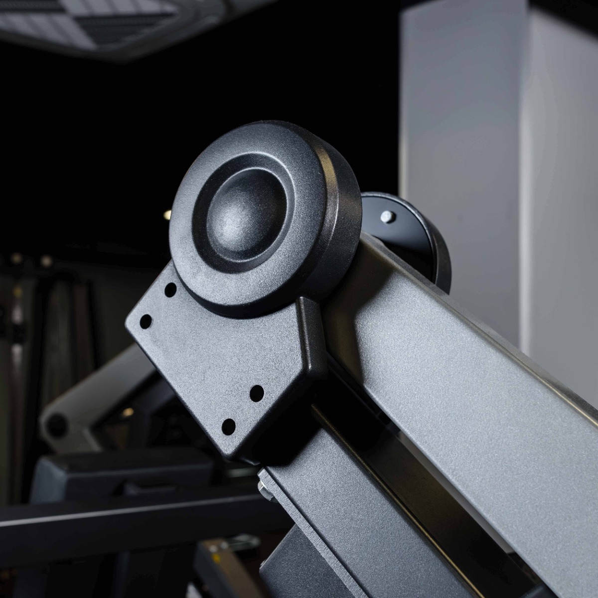 На подвижных рычагах для работы со свободными весами установлено два литых хромированных накопителя из толстостенной стальной трубы длиной 210 мм (рабочая длина 185 мм без учета заглушек и демпферов) для дисков с посадочным диаметром 50 мм. На торцах при помощи болтов закреплены металлические заглушки.
