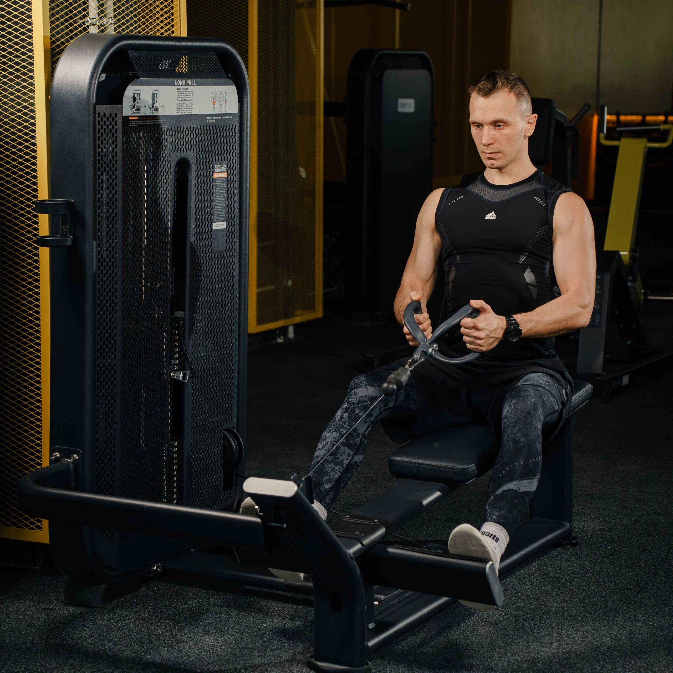 Профессиональный тренажер для коммерческого использования E7033 Гребная тяга. Горизонтальный блок предназначен для изолирующих упражнений на широчайшие мышцы спины, бицепсы, дельтовидные и трапециевидные мышцы.