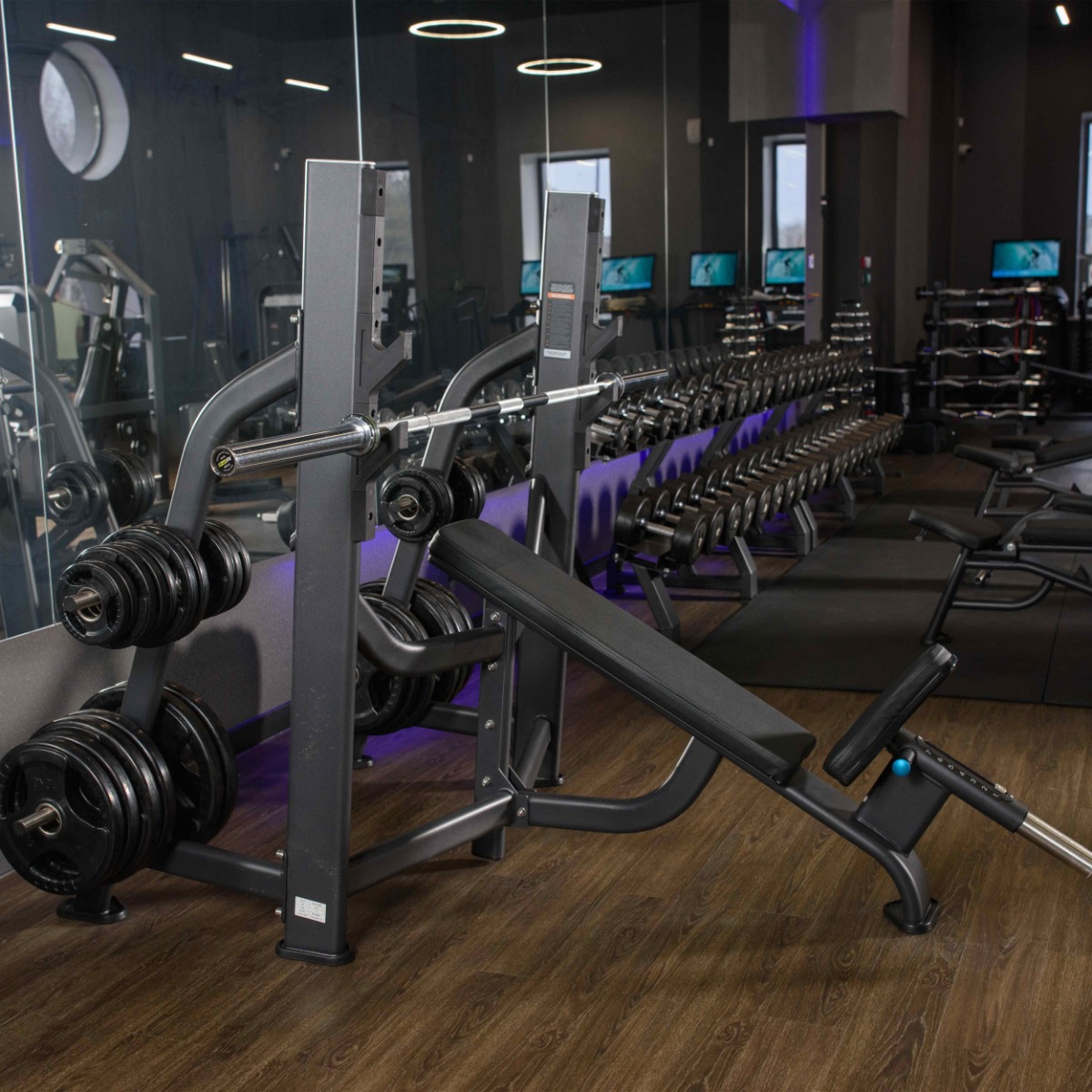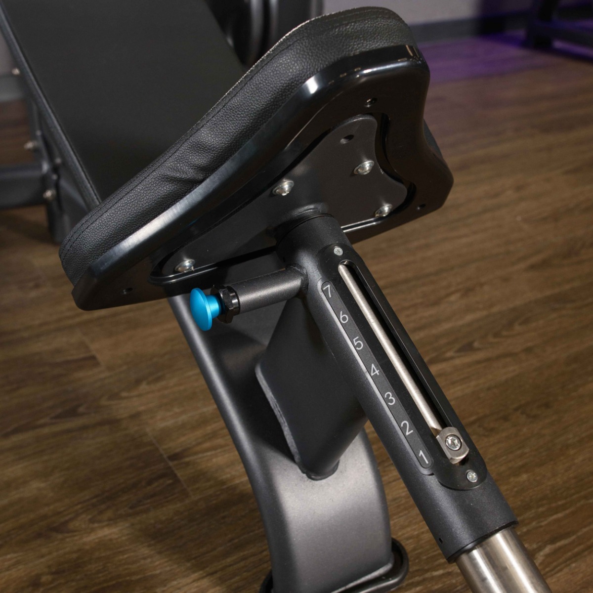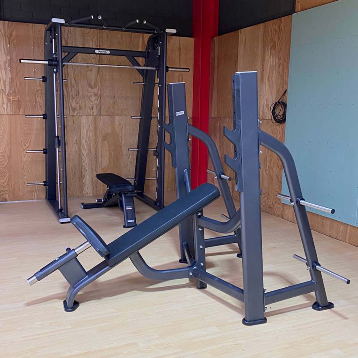 Профессиональный тренажер для коммерческого использования E7042 Скамья-стойка для жима под углом вверх предназначен для проработки больших грудных мышц, передних дельт и трицепсов.