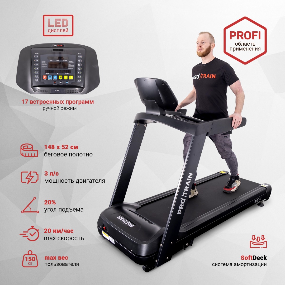 Беговая дорожка Protrain ST-1 с двигателем мощностью 3 лошадиных силы (пиковая мощность — 6 л.с.) позволяет пользователям разгоняться до 20 км/ч.Область применения: профессиональная;Мощность двигателя: 3 л.с;Максимальный вес пользователя: 150 кг;Длина полотна: 148 см;Ширина полотна: 52 см;Скорость: 20 км/ч; Угол наклона: 18%; Консоль/дисплей: LED-дисплей;Программы и функции: 12;Размеры товара в сборе: 186 х 95 х 143 см.