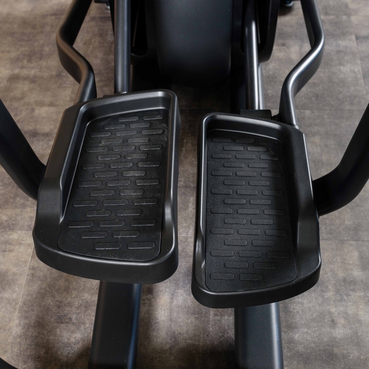 Широкие педали тренажера имею прорезиненное рифлёное амортизирующее покрытие для исключения соскальзывания стопы и надежной фиксации положения ног при выполнении упражнения.
