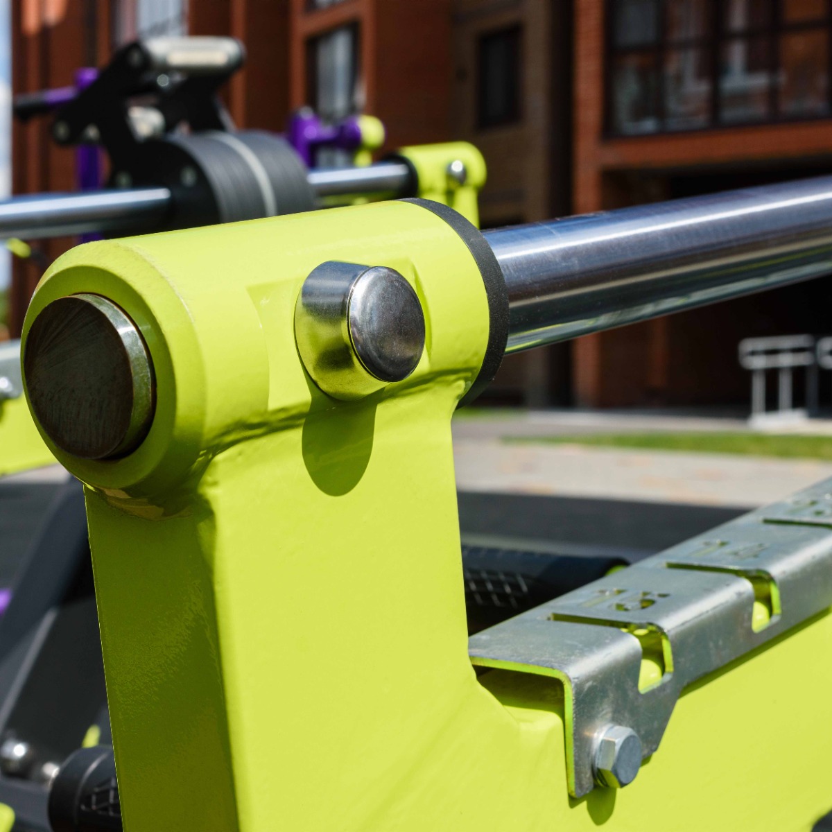 Надёжность и прочность разъёмных соединений конструктивных элементов тренажёра обеспечиваются за счёт использования высококачественного оцинкованного крепежа, выступающие части которого закрыты металлическими защитными колпачками.