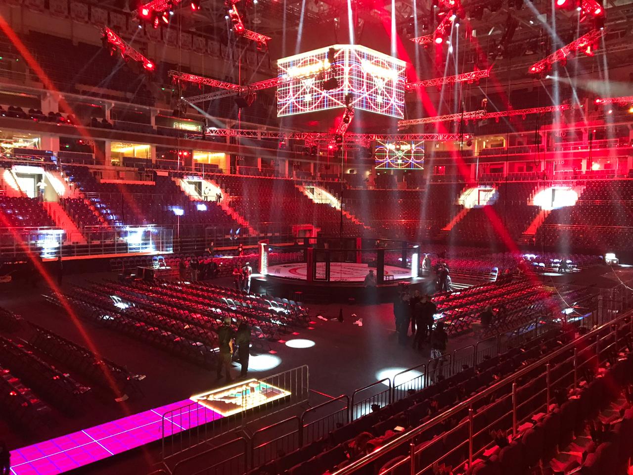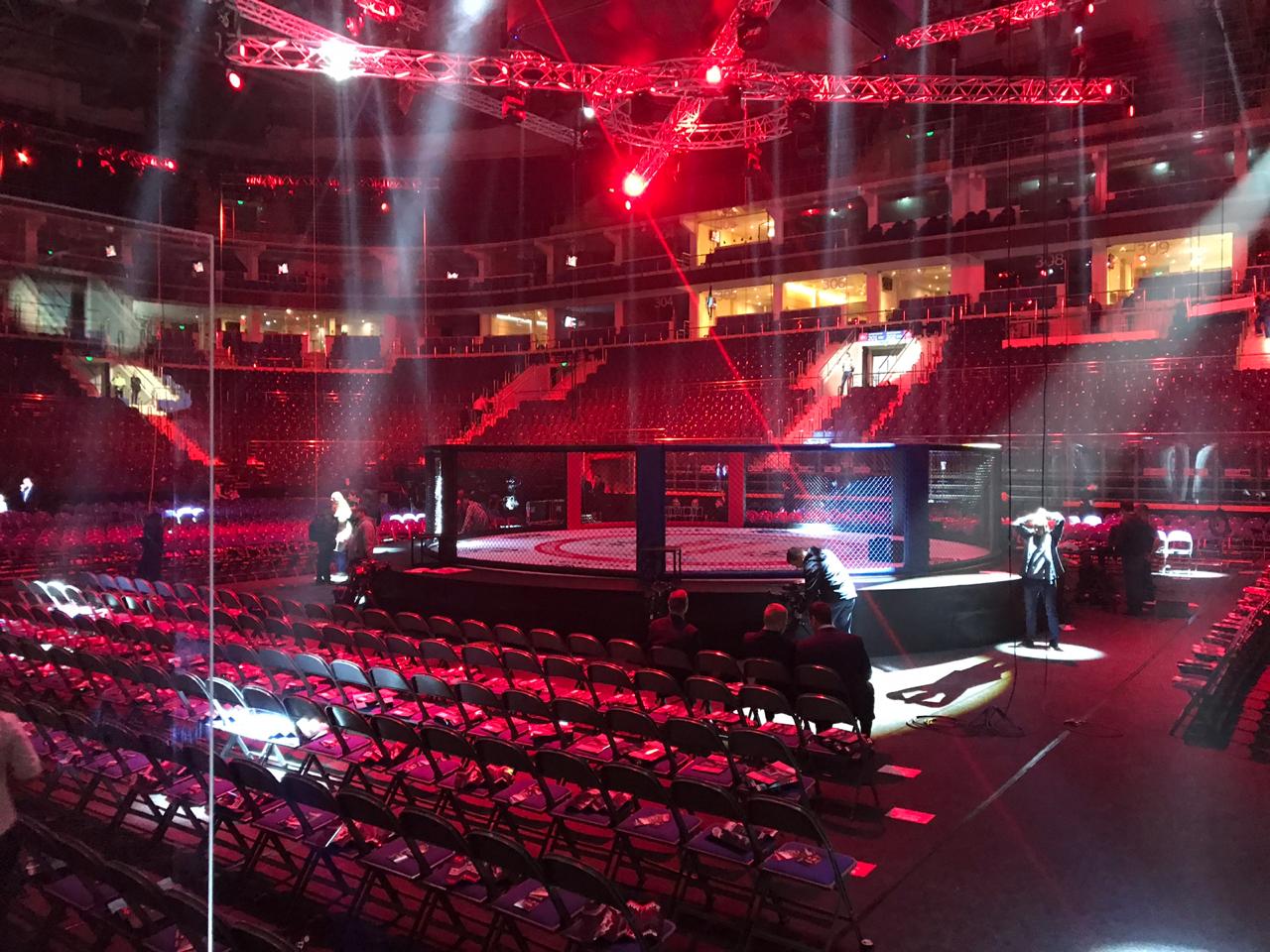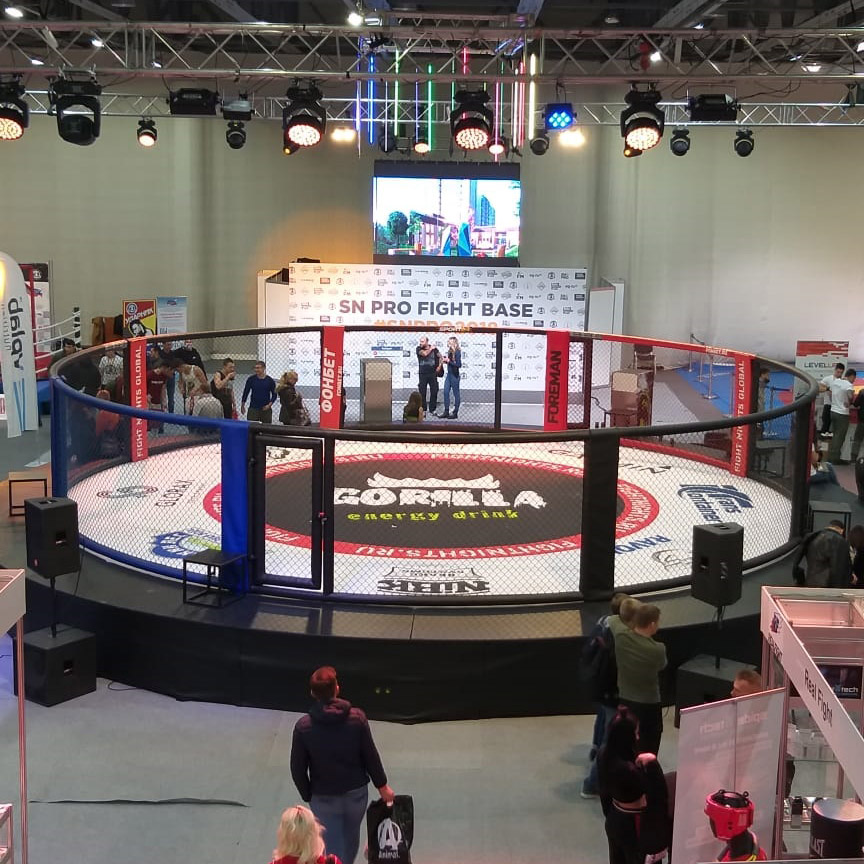 Диаметр боевой зоны MMA арены составляет 10 метров, по периметру размещены пять стоек для операторов, а секции ограждения выполнены в полуциркульной форме образуя идеальную окружность. Две контрастные секции красного и синего цвета — «углы» ММА ринга, позволяют сориентировать спортсмена в начале каждого раунда.
