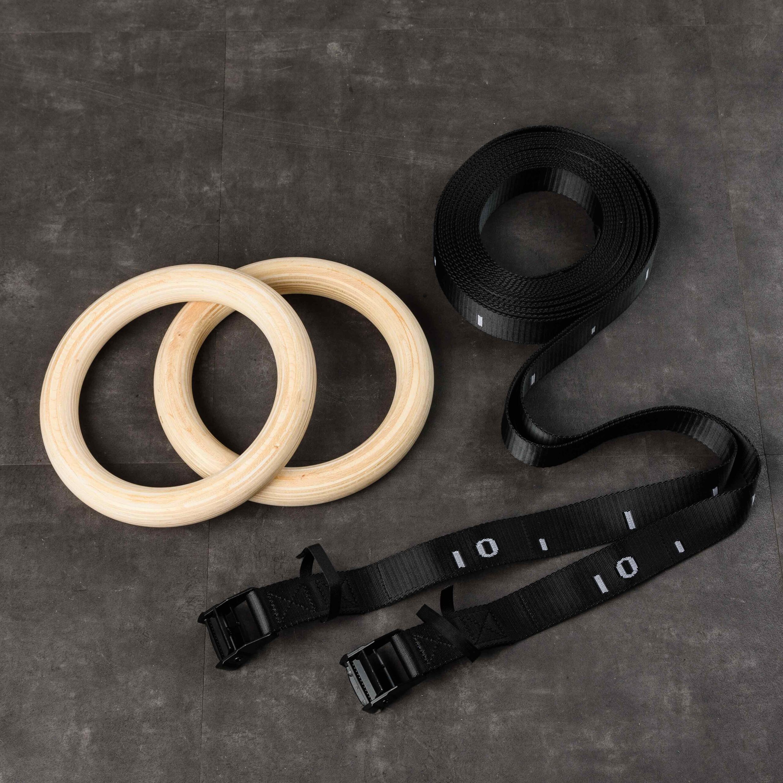 Гимнастические кольца представляют собой пару колец, изготовленных из многослойной фанеры, на которые установлены стропы. Поверхность колец тщательно отшлифована и имеет гладкую поверхность. В комплект входят пряжки пружинные для фиксации стропы.Благодаря удобному способу крепления — специальной системе подвеса, состоящей из прочнейшей стропы (каждая рассчитана на нагрузку в 1 тонну) и пружинного замка с расчетной нагрузкой в 250 кг, снаряд легко регулируется по высоте и просто фиксируется к любой горизонтальной перекладине (турник, детские качели, ветка дерева). Имеют специальный замок, расположенный на ремне для фиксации длины. Кольца хорошо зарекомендовали себя направлениях как Workout, Crossfit и в спортивной гимнастике. Упражнения на этом снаряде развивают мышцы рук, груди, плечевого корпуса и пресса. Тренируют чувство равновесия, выносливость, координацию.