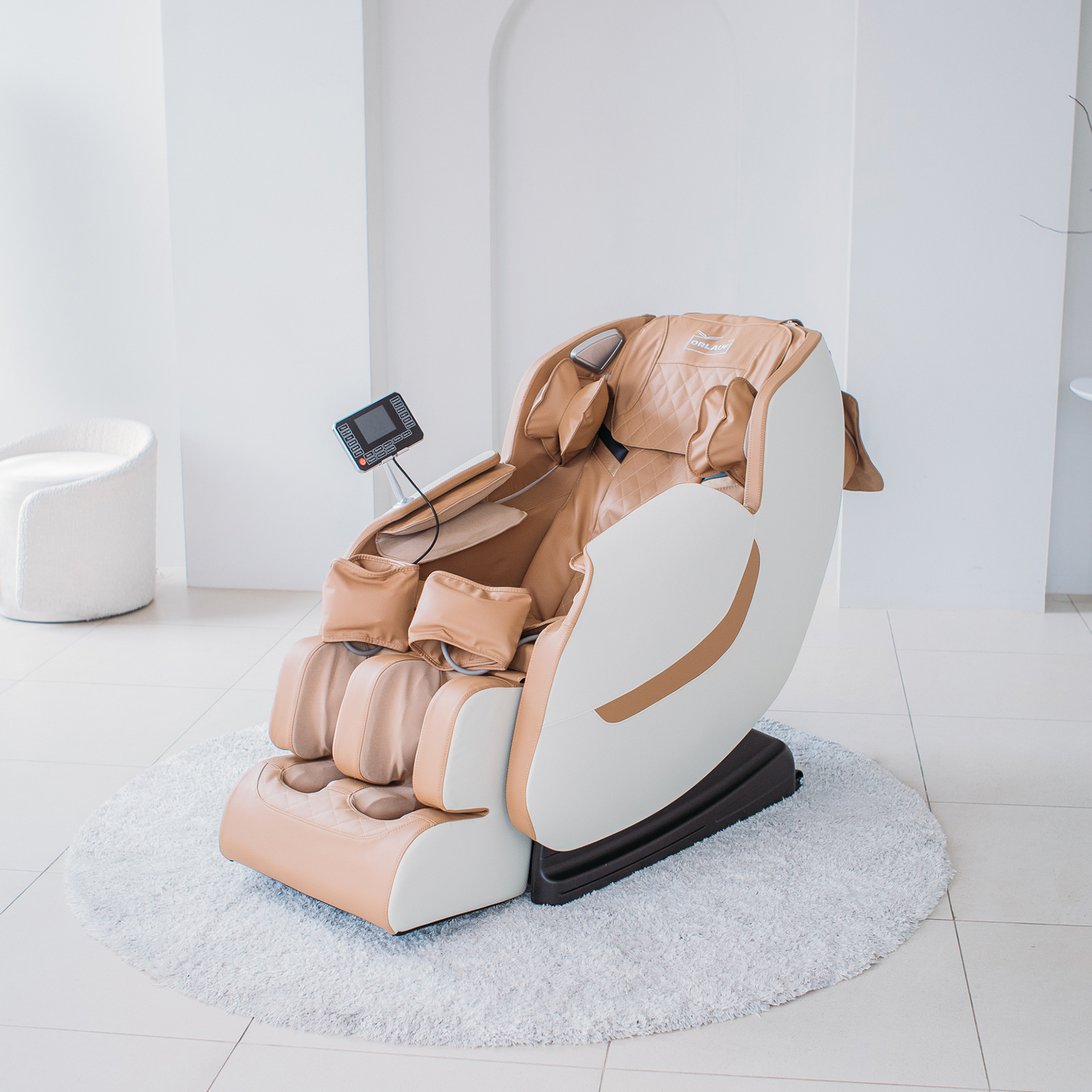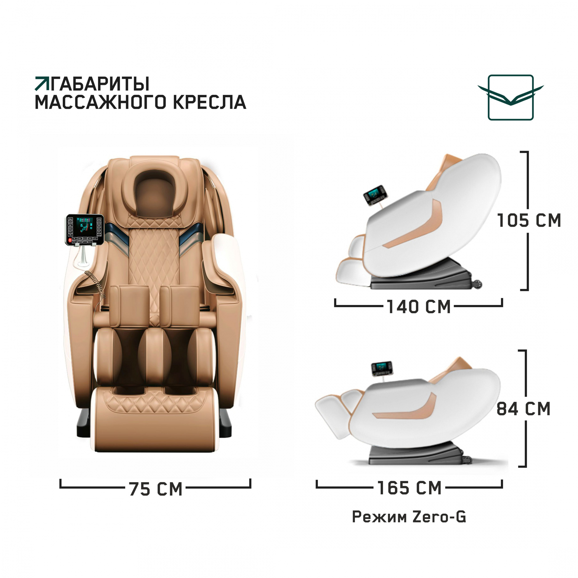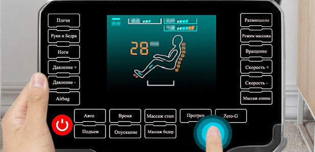 Кресло управляется с удобного большого планшета, закрепленного на подлокотнике. Меню планшета русифицировано. Установлено 5 автоматических программ — комфорт, сон, расслабление, обновление и восстановление. Чтобы массаж был более эффективным, в области поясницы и икр есть прогревание.