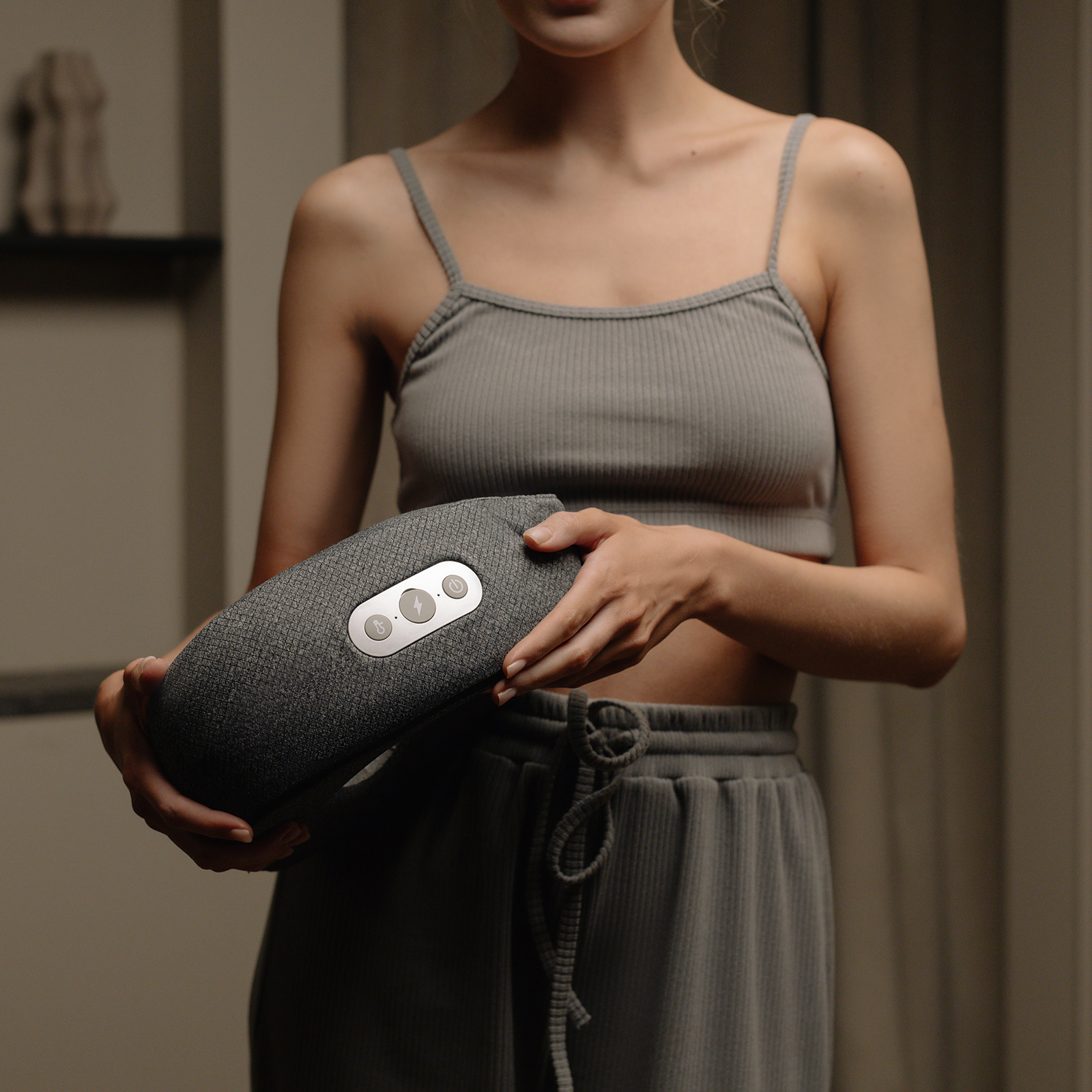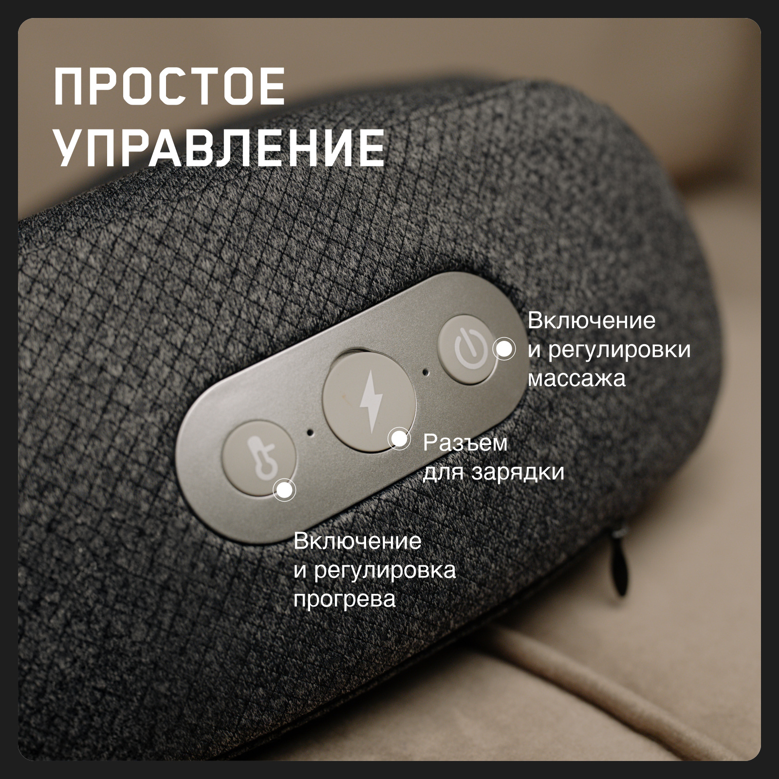 Для управления сбоку на подушке есть небольшая панель. Она устроена просто и не утяжеляет массажер. На ней расположены кнопки управления, световые индикаторы и порт для зарядки. К динамикам массажера по Bluetooth можно подключить гаджет и слушать любимую музыку.