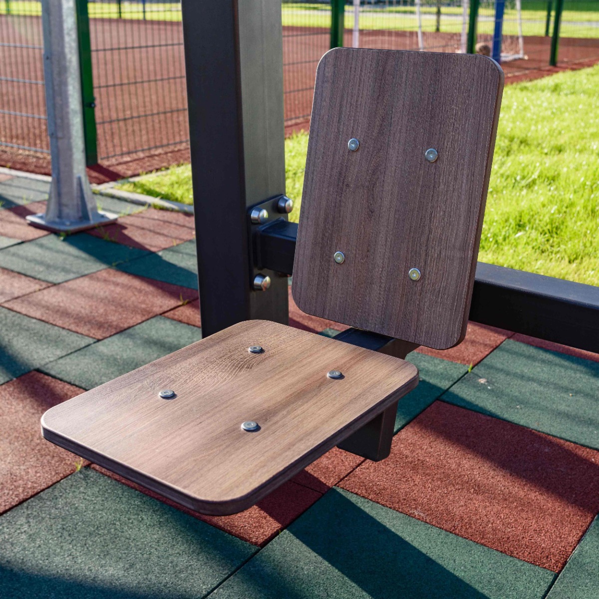 Сиденье 410×300 мм и скамья тренажера 410×300 мм выполнена из высокопрочного ударостойкого HPL-пластика толщиной 12 мм.