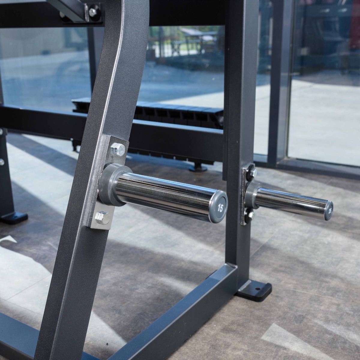 Количество хромированных накопителей для хранения свободных весов: шесть накопителей из толстостенной стальной трубы диаметром 48 мм. Максимальный вес на накопитель: 100 кг.