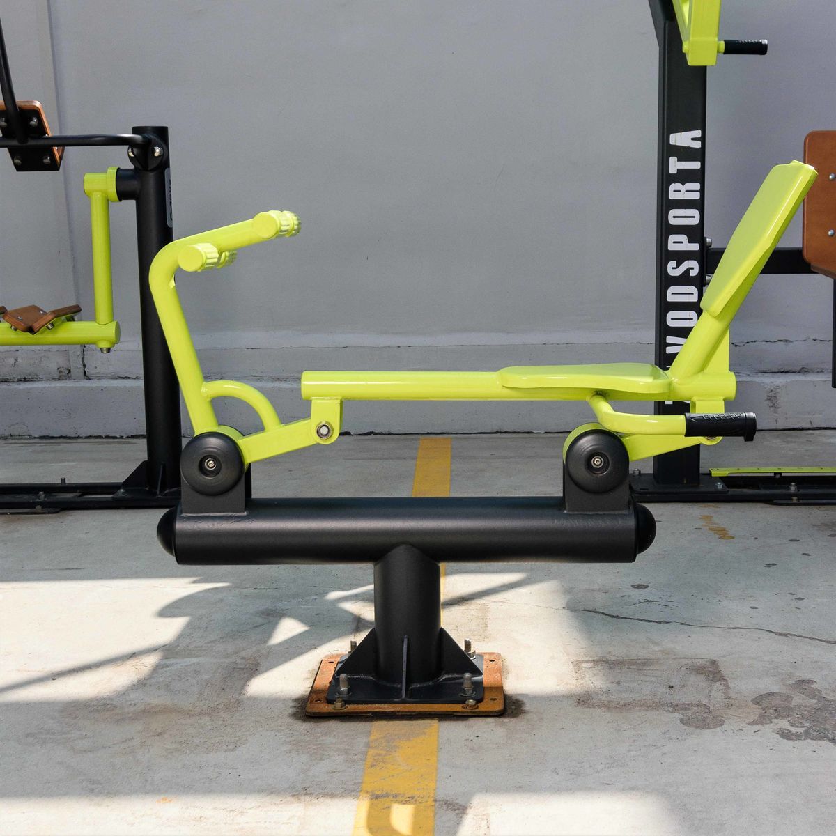 Оборудование состоит из опорного столба, сиденья со спинкой и рукоятью, рычага и рычага с упорами для ног, закладной. Закладная монтируется в грунт и заливается бетоном. Опорный столб крепится к закладной за счет фланцевого соединения и отсыпается песчано-гравийной смесью до уровня площадки. Фланцевое крепление позволяет надёжно смонтировать оборудование и беспрепятственно демонтировать при необходимости обслуживания. Монтажные схемы прилагаются к комплекту поставки.