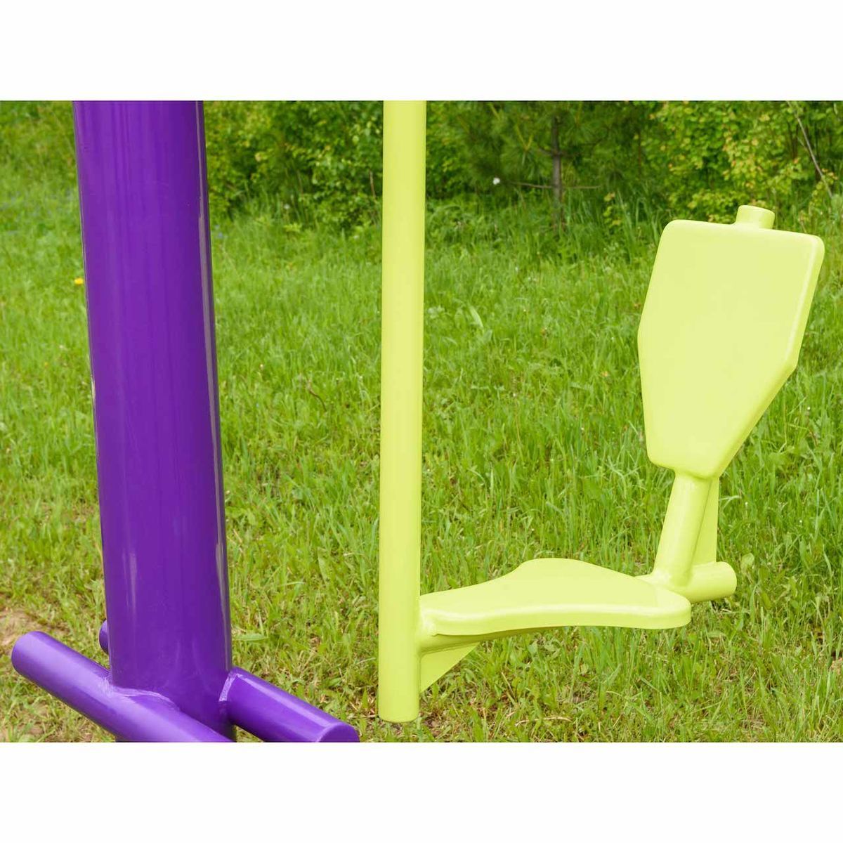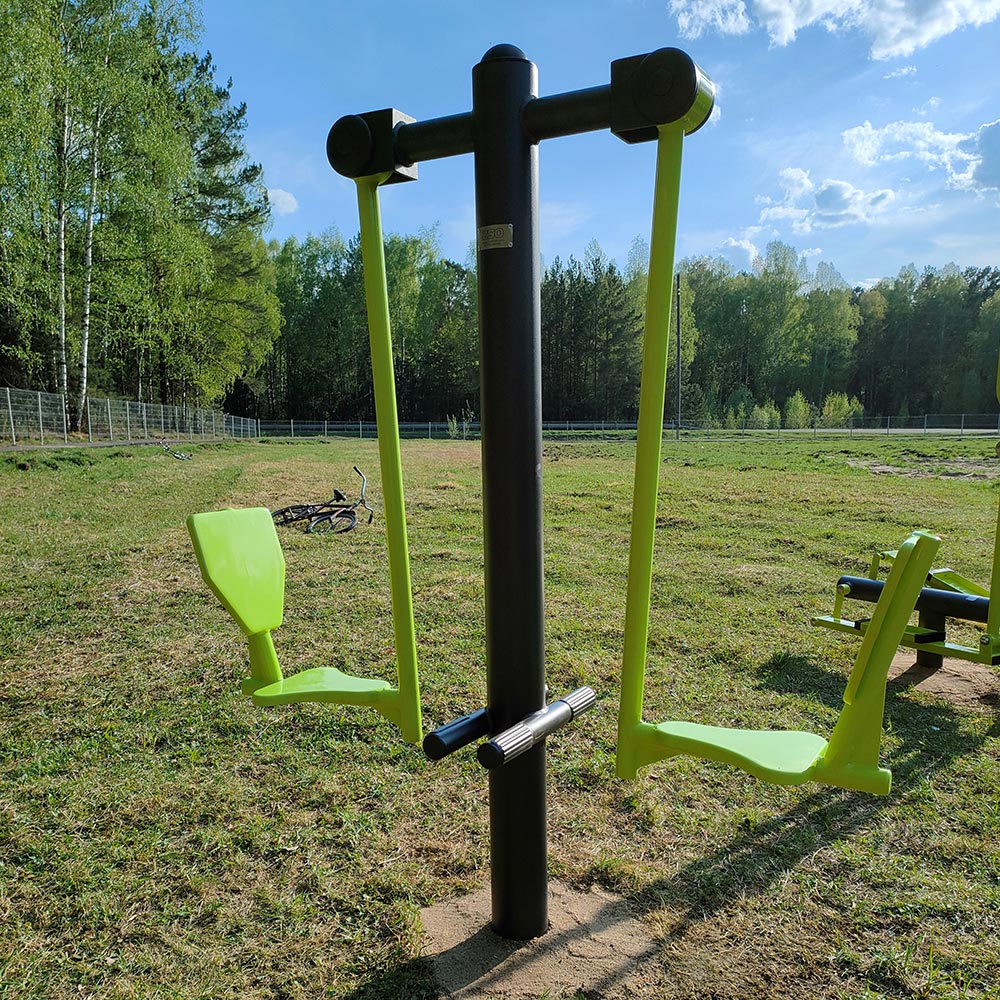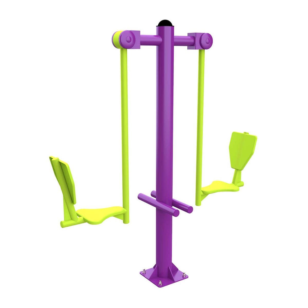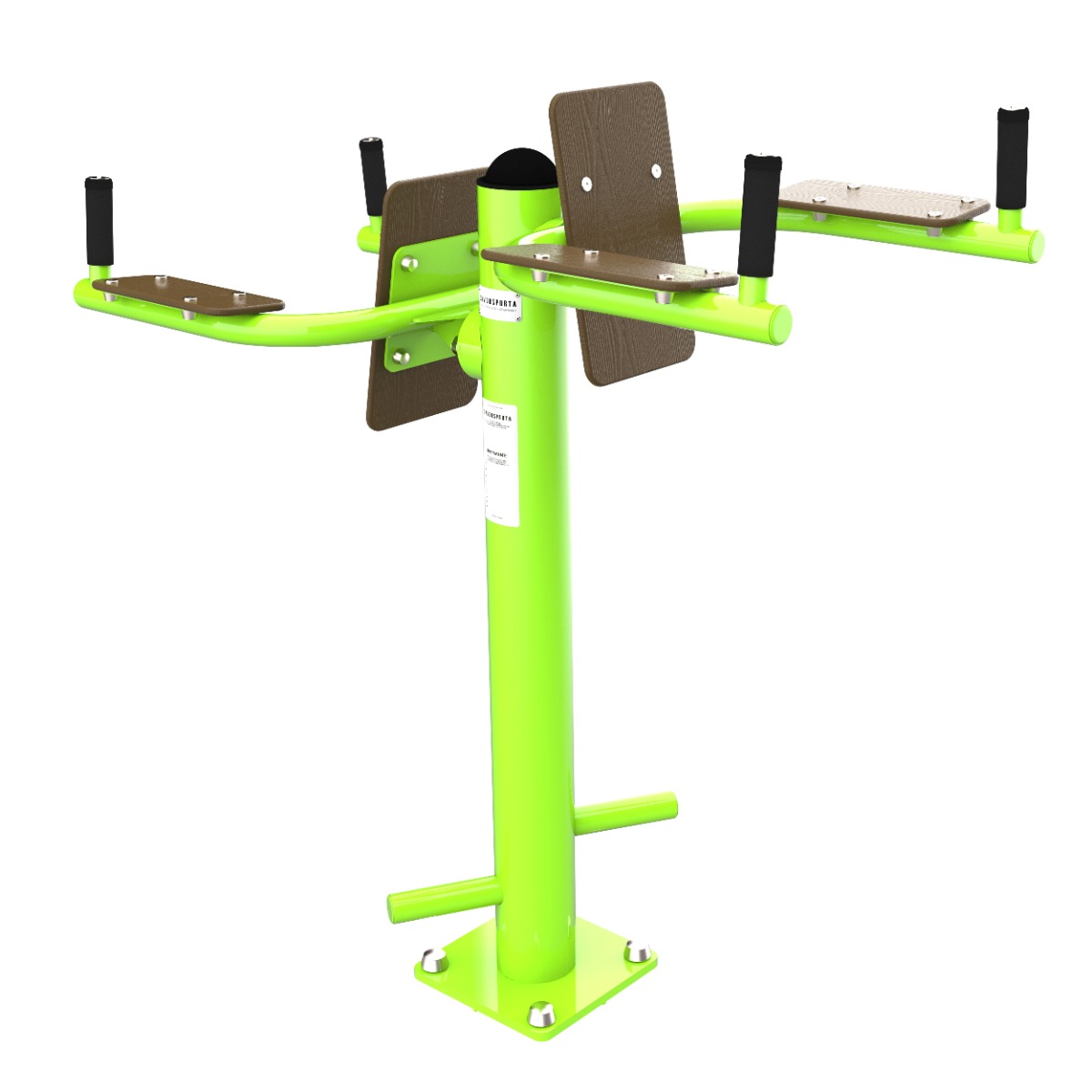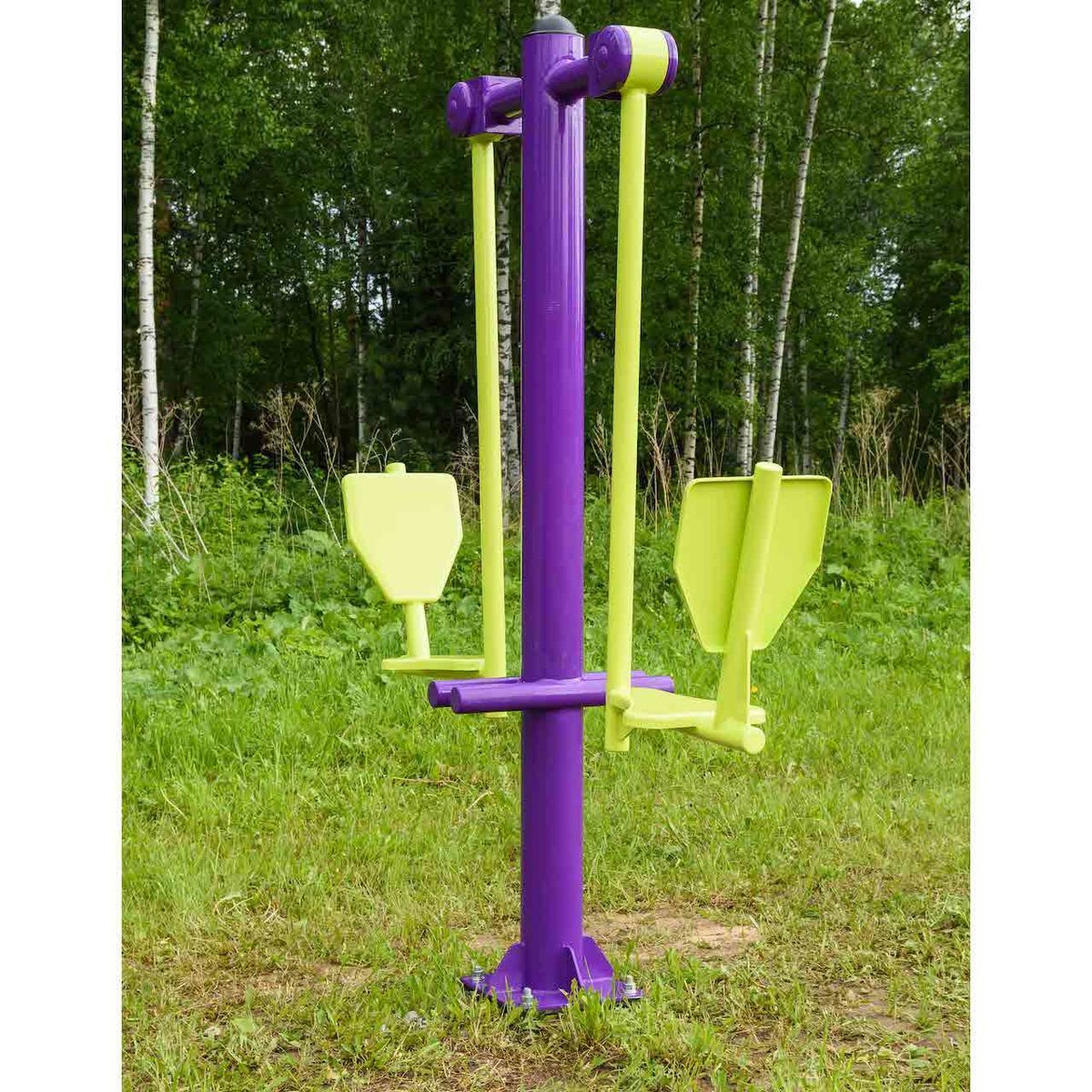 Оборудование состоит из опорного столба, рычагов со спинками и сиденьями, упоров для ног и закладной. Закладная монтируется в грунт и заливается бетоном. Опорный столб крепится к закладной за счет фланцевого соединения и отсыпается песчано-гравийной смесью до уровня площадки. Фланцевое крепление позволяет надёжно смонтировать оборудование и беспрепятственно демонтировать при необходимости обслуживания. Монтажные схемы прилагаются к комплекту поставки.