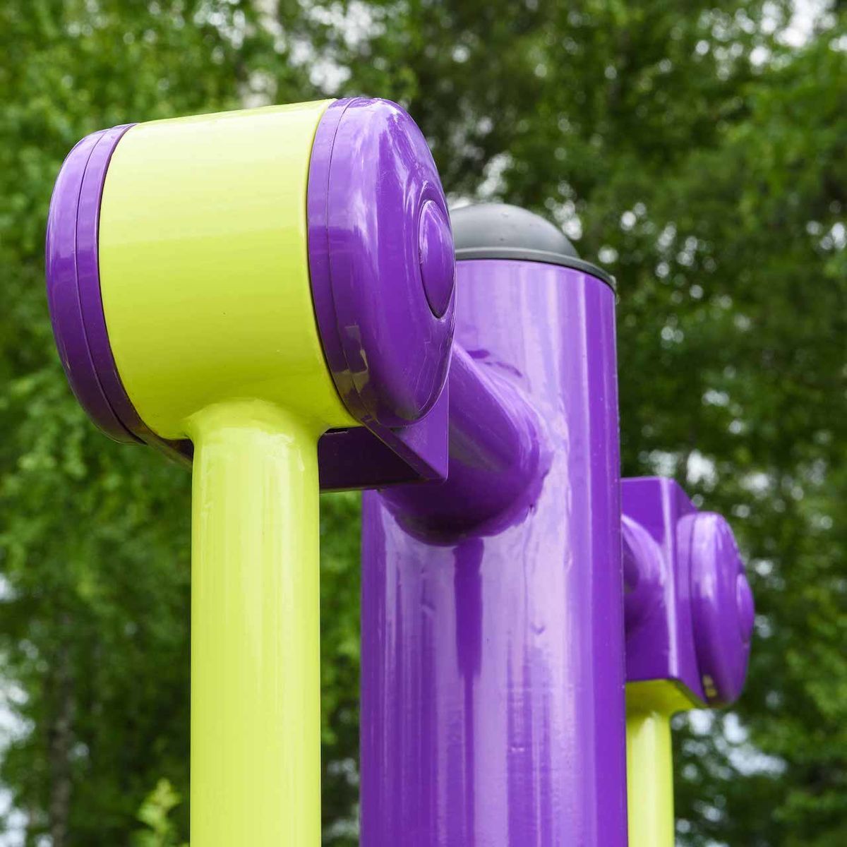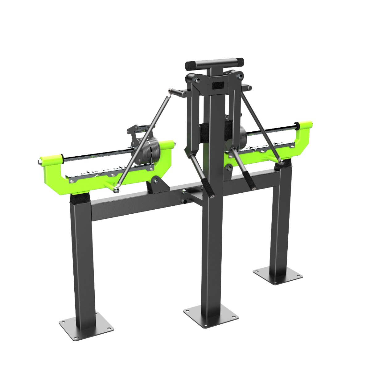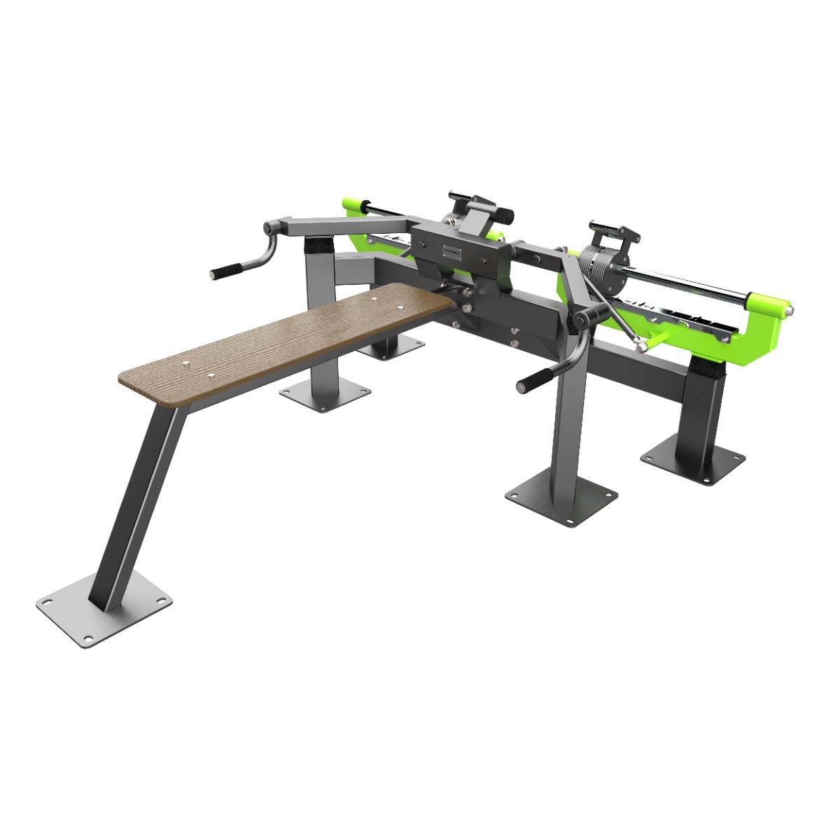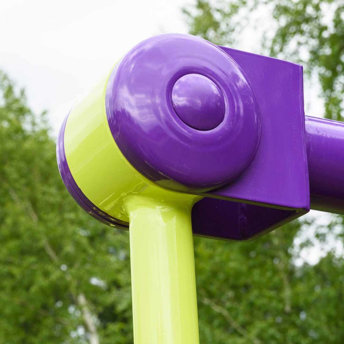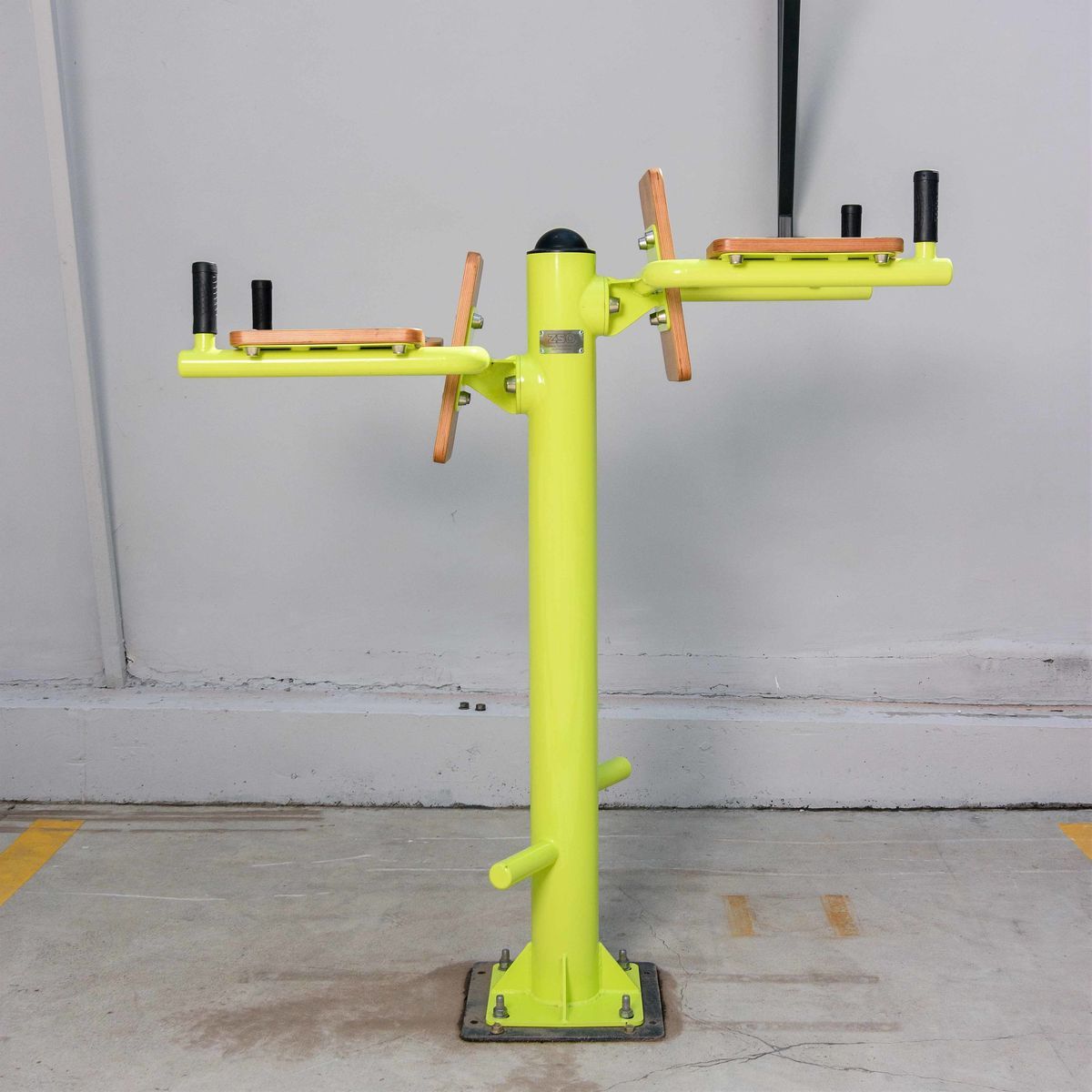 Оборудование состоит из опорного столба, рычагов со спинками и сиденьями, упоров для ног и закладной. Закладная монтируется в грунт и заливается бетоном. Опорный столб крепится к закладной за счет фланцевого соединения и отсыпается песчано-гравийной смесью до уровня площадки. Фланцевое крепление позволяет надёжно смонтировать оборудование и беспрепятственно демонтировать при необходимости обслуживания. Монтажные схемы прилагаются к комплекту поставки.
