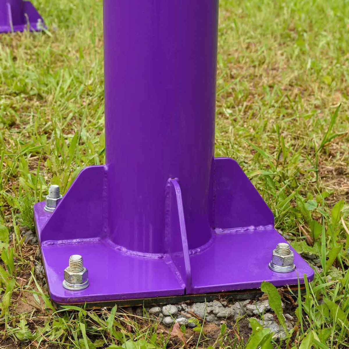 Фланцевое соединение опорного столба с закладной производится через четыре овальных отверстия размером 22×30 мм, расположенных на расстоянии 240 мм. Овальные отверстия под болтовое крепление М16 позволяют дополнительно регулировать положение тренажера. Резьбовые соединения защищены составными металлическими колпачками, входящими в комплект поставки.