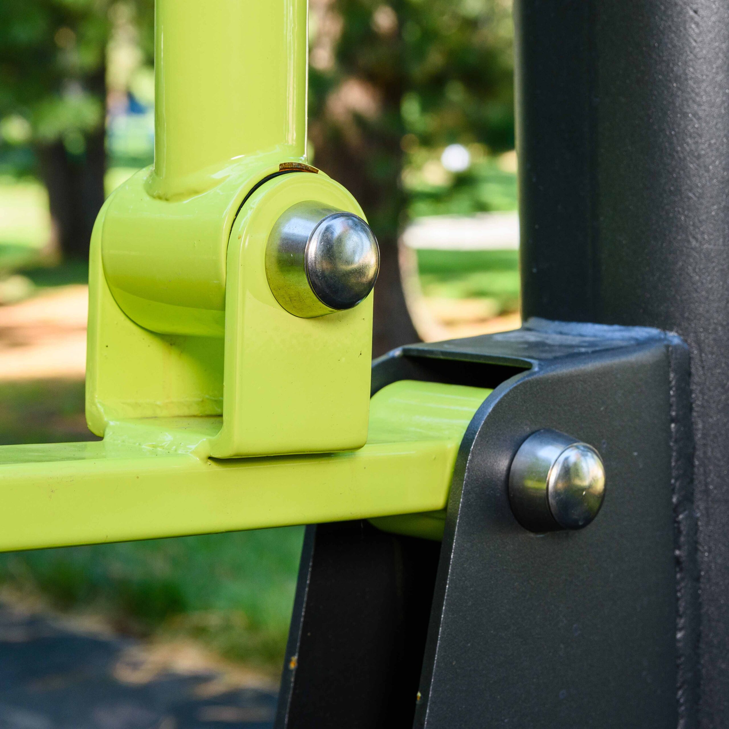 Фланцевое соединение опорного столба с закладной производится через четыре овальных отверстия размером 22×30 мм, расположенных на расстоянии 240 мм. Овальные отверстия под болтовое крепление М16 позволяют дополнительно регулировать положение тренажера. Резьбовые соединения защищены составными металлическими колпачками, входящими в комплект поставки.
