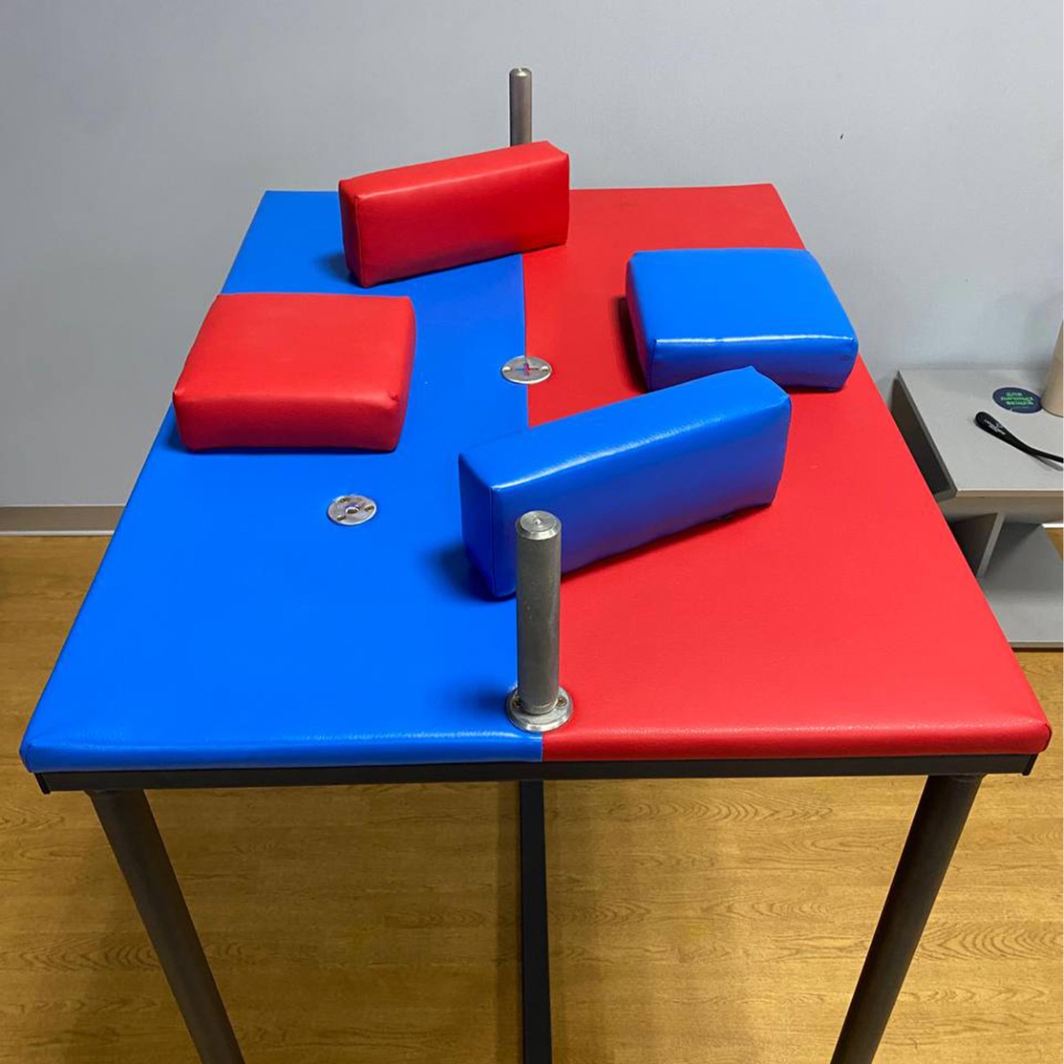 Подлокотник изготовлен таким образом, чтобы его края не имели закругленности Состоит из фанеры 15 мм и мягкой специальной подложки из вторично-вспененного полиуретана с обивкой двух-цветным кожзаменителем. Научно доказано, что борьба на асимметрических подлокотниках на много безопаснее, чем на параллельных.
