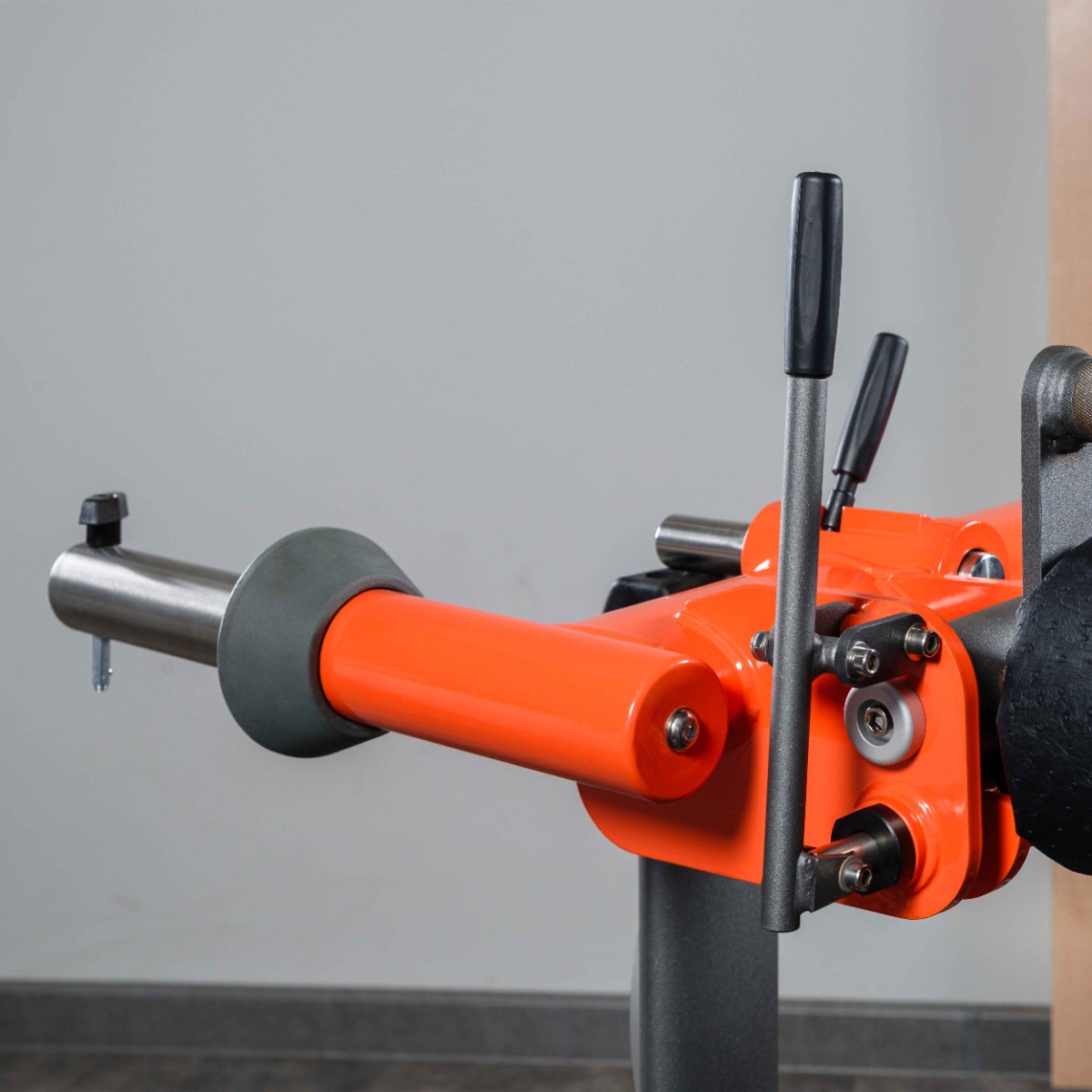 Узел «валик–рукоять» оснащён механизмом откидывания для удобного захода и выхода из тренажёра. Управление производится при помощи рычага фиксации, расположенного справа от валика. При потягивании рукояти на себя валик поднимается вручную и фиксируется в верхнем положении.