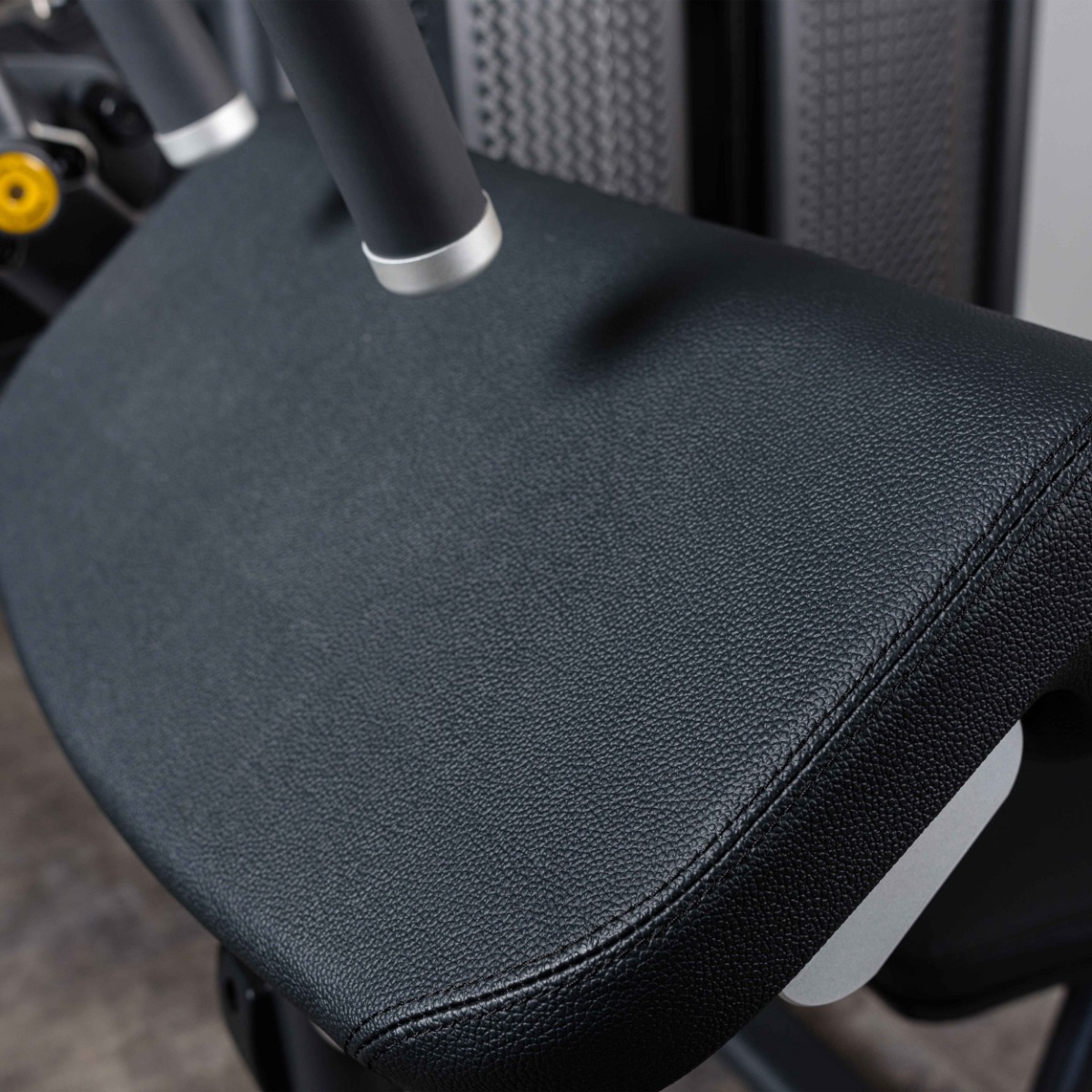 Металлическая перфорированная защита весового стека с лицевой стороны и сплошная защита с задней стороны выполнена из листового металла толщиной 2 мм. Ребра жесткости у основания, примыкающие к несущей раме через скрытое болтовое соединение сечением 6 мм в восьми точках, повышают эксплуатационные параметры тренажера.