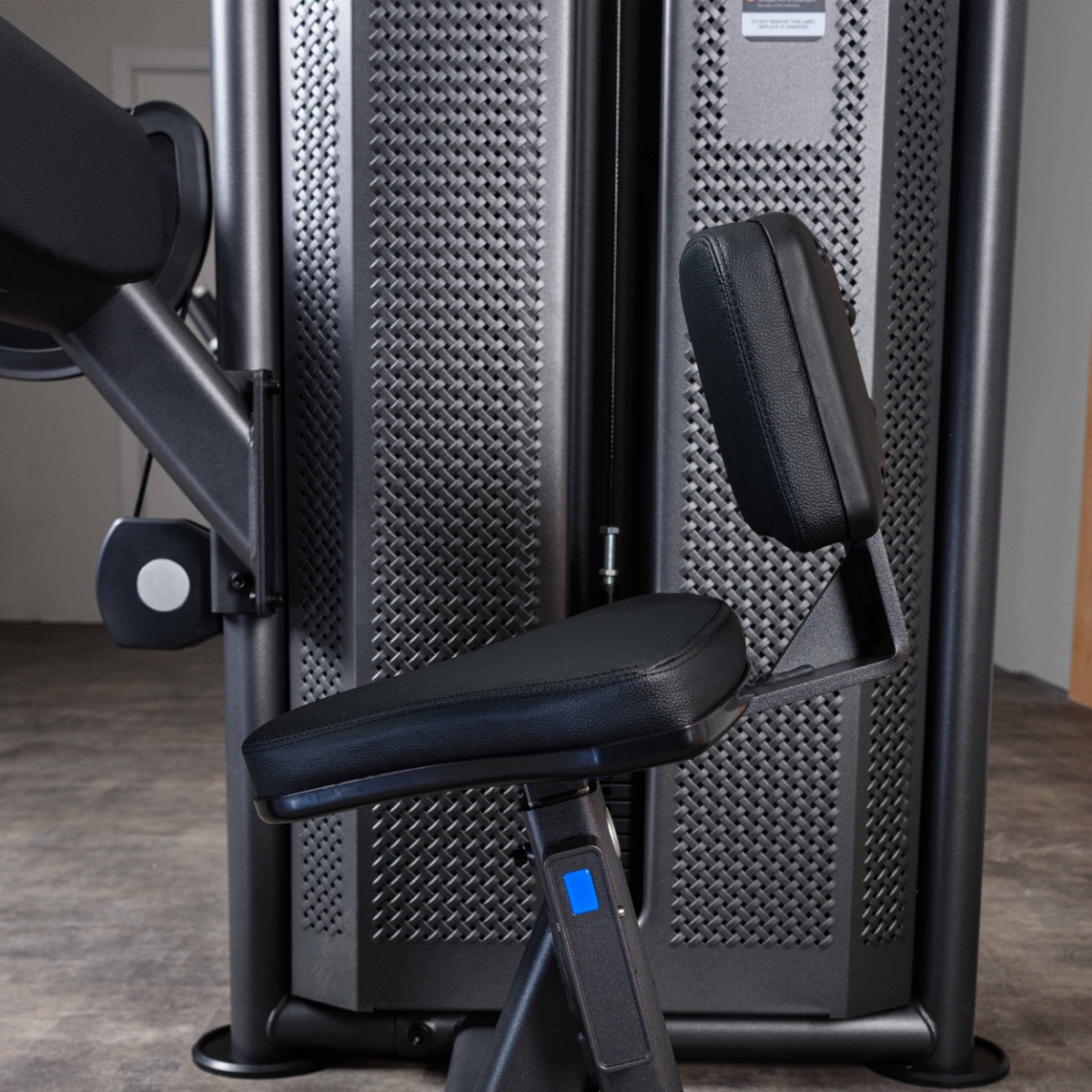 Металлическая перфорированная защита весового стека с лицевой стороны и сплошная защита с задней стороны выполнена из листового металла толщиной 2 мм. Ребра жесткости у основания, примыкающие к несущей раме через скрытое болтовое соединение сечением 6 мм в восьми точках, повышают эксплуатационные параметры тренажера.